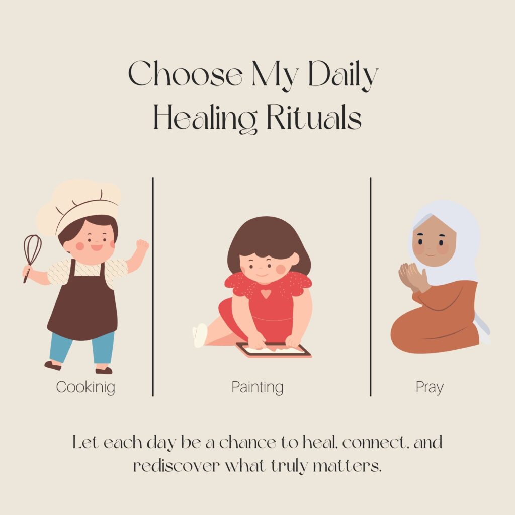 These are the rituals I practice, imperfect but genuine. Drawing, cooking, listening, praying. Healing isn’t about dramatic transformation or perfect schedules—it’s about returning to things that bring joy, comfort, and a sense of meaning. I’m learning, little by little, that daily healing rituals are what make even quiet days special.